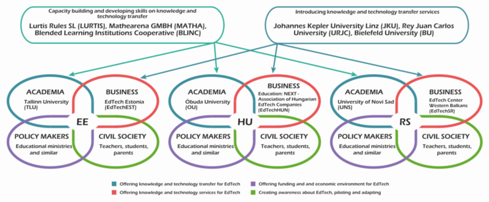 Istovremeno, većina EdTech kompanija fokusira se na prikupljanje investicija za inovacije, sa manje naglaska na pedagoškim ciljevima svojih usluga. Nažalost, trenutna potražnja estonskog, mađarskog i srpskog EdTech sektora za kupovinom usluga znanja od lokalnih univerziteta je vrlo niska. Slično tome, spremnost univerziteta da pruže ove izuzetno vredne obrazovne usluge je takođe vrlo niska. Cirkulacija talenata između sektora i saradnja između akademske i poslovne sfere za prenos znanja zahteva sistematske i strukturirane napore. Imajući sve ove faktore u vidu, ovaj predlog ima za cilj pronalaženje rešenja za trenutne izazove na individualnom, institucionalnom i ekosistemskom nivou inovacija u oblasti EdTech-a.